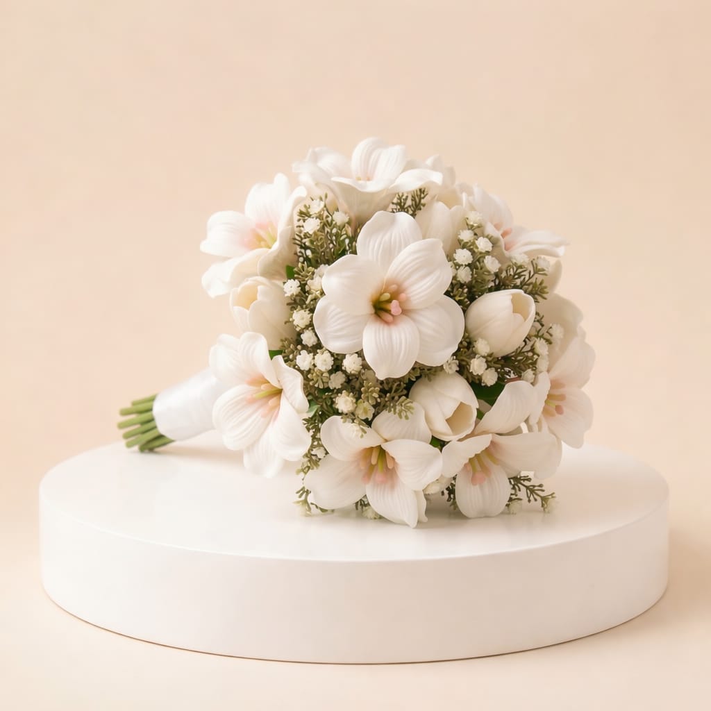 بوكيه يجمع بين البساطة والرقة في تصميم واحد يخطف القلب حيث يتكون من 25 وردة موزعة بتناغم بين جمال التيوليب الأبيض المقفول ونعومة زهور الياسمين المتفتحة بقلبها الوردي الهادئ وتكتمل شياكة التنسيق بلمسات رقيقة من زهور البيبي فلور التي تملأ الفراغات بحيوية وجمال طبيعي وكل هذا ملفوف بشريط ستان أبيض ناعم بلمعة خفيفة ليعطي مظهراً كلاسيكياً راقياً يناسب العروس الرقيقة التي تبحث عن إطلالة هادئة ومميزة في ليلة العمر